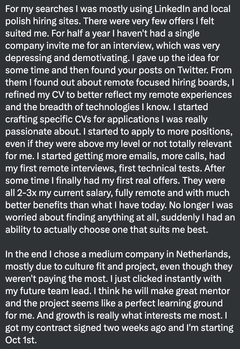 What's even more fascinating to me. I've also been receiving DMs of people who found remote jobs just by leveraging the tips I'm sharing on Twitter and on this newsletter. Read this excerpt of a DM I received this week from a fellow Remote Worker in Poland: