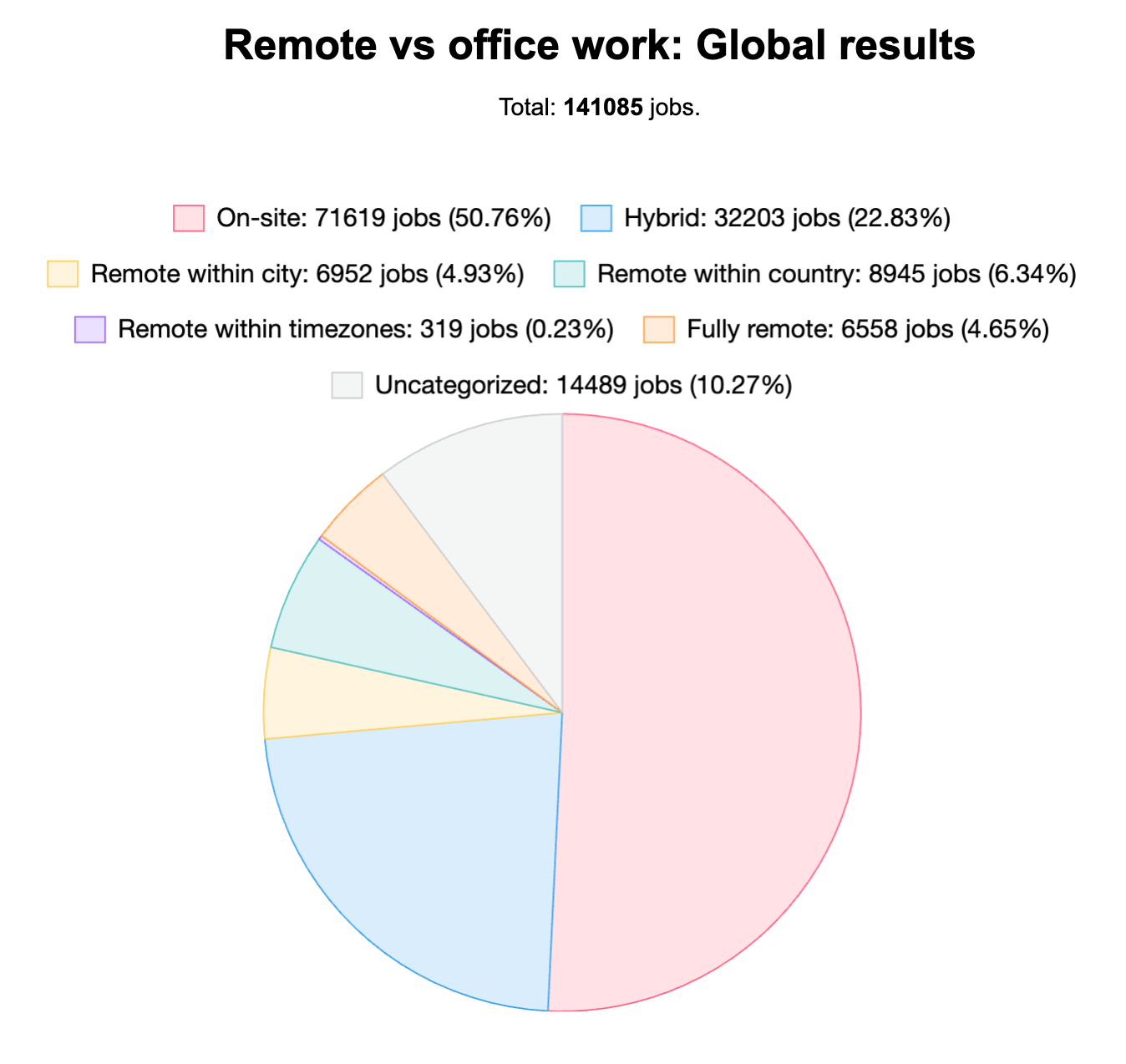 I'm starting to generate some reports from the JobsCopilot database, on a weekly basis. See this sample of ~145k jobs openings from last week. Certainly most of them are in the office (50%) or hybrid (22%). But there are more than 22k job openings were created for remote jobs, including over 6k that are fully remote without geographical constraints.