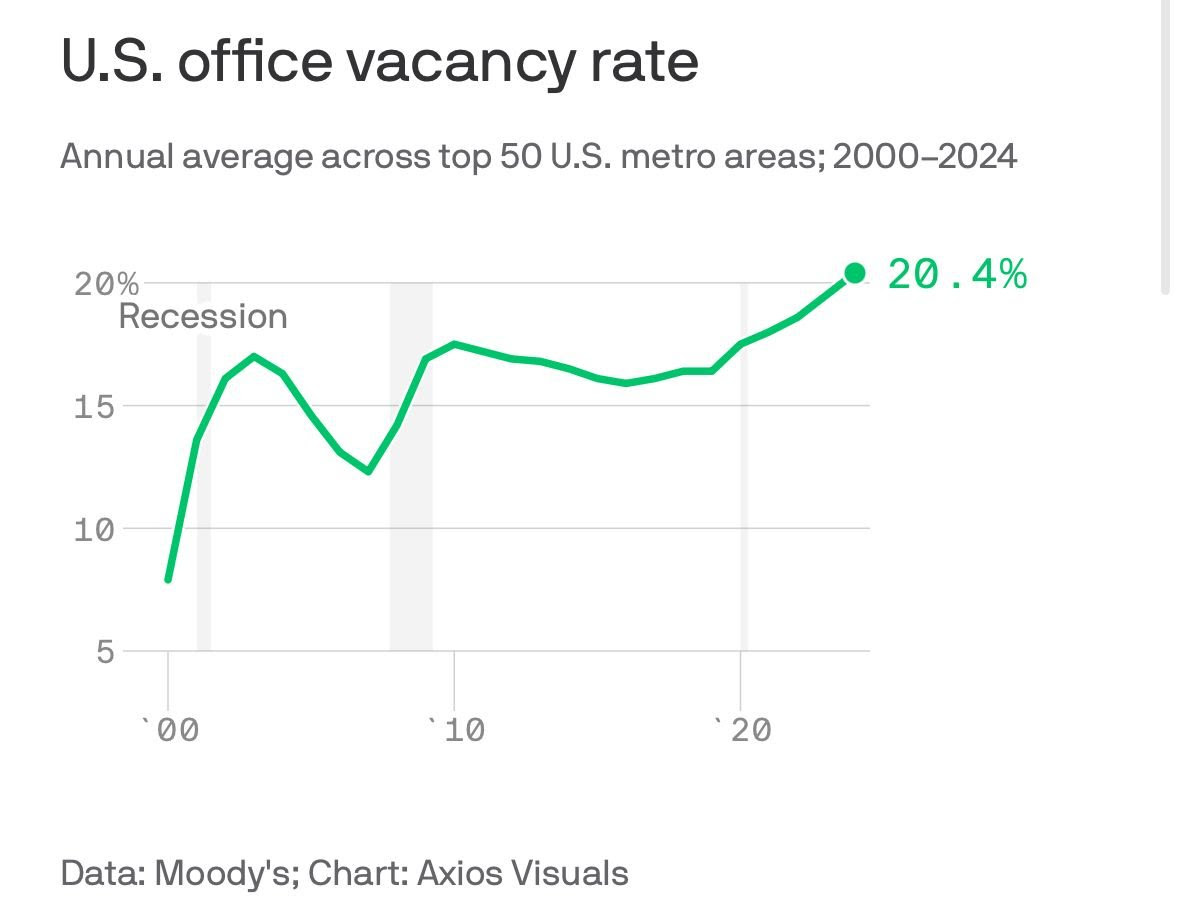 However, we occasionally have market studies unveiling the actual truth: Office occupancy is at it's lowest level ever. Like this recent study by Moody's and Axios: